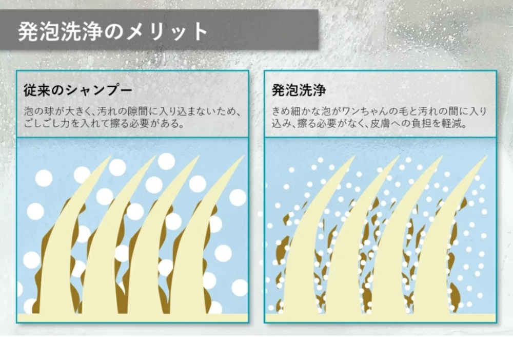 また必要以上にこすり洗いをする必要がないので、わんちゃんの皮膚や被毛への負担を最小限に抑えることができます。